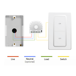 The compact radio module (60% smaller than its predecessor Micro Smart Switch) is placed in a wall box right behind the normal switch. The switch is no longer directly connected to the load but acts as input device for the AEOTEC insert that is controlling the load. The switch only sends control signal to the insert which controls the load then again. The solution works with all switch design. You can use a momentary or a toggle switch. It’s recommended to use wall boxes with 65mm depth. But smaller boxes with only 45mm depth can be used also if there is enough space behind the switch. The available space depends on the size of the traditional switch, the dimensions of the wall box and the amount of additional cabling placed in this box.