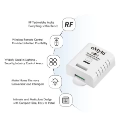 - More Flexibility: eMylo RF Relay Switch adopts non-directional wireless encoding technology, allowing independent control without mutual interference, can be flexibly configured in quantity and in operating modes.